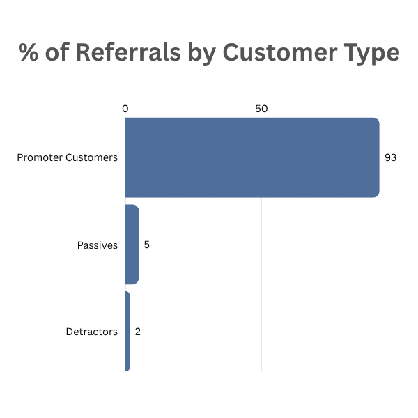 Perhaps more interesting is which type of customer is providing referrals. As the following chart shows, 93% of those giving referrals were Promoters (gave 9s or 10s on the likelihood-to-recommend question).