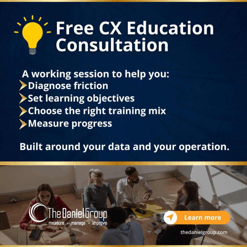 We’ve launched a free CX Training Consultation designed to help you identify performance gaps, clarify what problem you’re trying to solve, and build a practical training plan tailored to your data, culture, and operational realities.